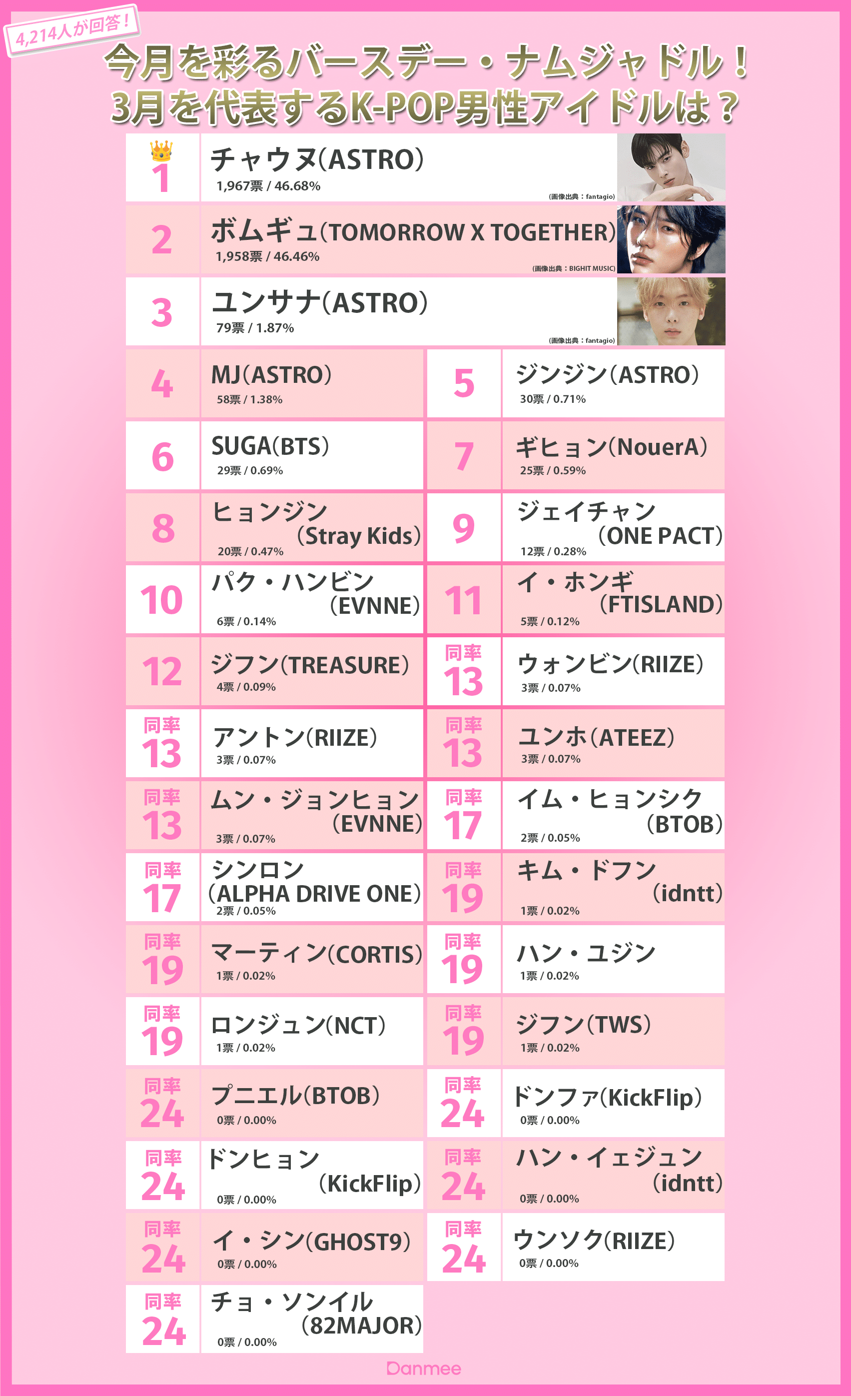 【推し度調査】チャウヌ、20代最後の誕生日で1位に!3月バースデーK-POP男性アイドル結果発表