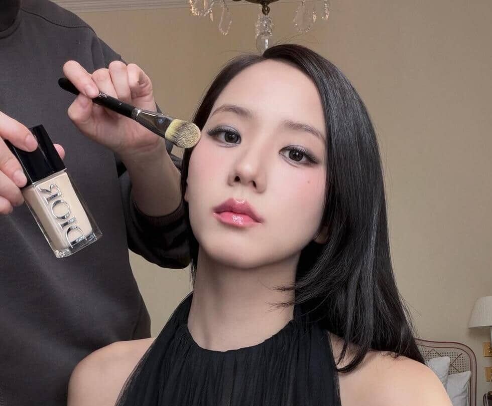 ジスの左側には、ディオールのロゴが入ったボトルタイプのファンデーションが手に持たれた状態で映り込んでいる。また別の手にはブラシが握られ、ジスの頬に向かって伸ばされていた。