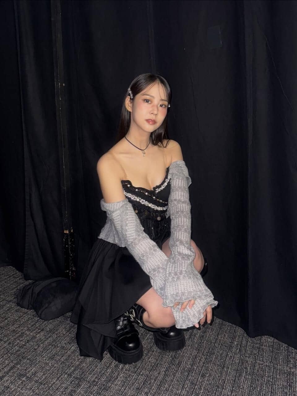 さらに、ヘアピンを取り入れたストレートヘアやネックレスなどのアクセサリーにも視線が集まり、全体として舞台活動と結びつくコンセプトルックを完成させている。暗いカーテンや室内の床が映り込むことで、ステージ裏の準備空間のような雰囲気も自然に伝わってくる。
