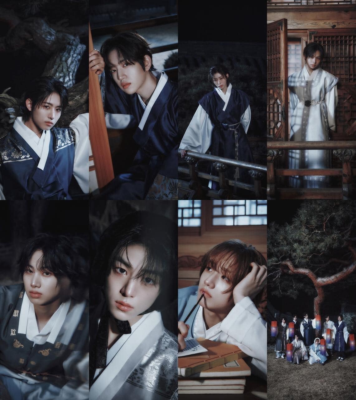 さらに、伝統模様の帯を合わせたグレーの衣装で大胆なビジュアルを見せたチュ・ユチャン、紫がかったグレー韓服で落ち着いた魅力を見せたパク・ソンヒョン、淡い空色とグレー韓服でディテールを活かしたペク・ジュンヒョク、清らかな印象を強調した末っ子チョン・セミンまで、メンバーごとのコンセプトが明確に表現された。