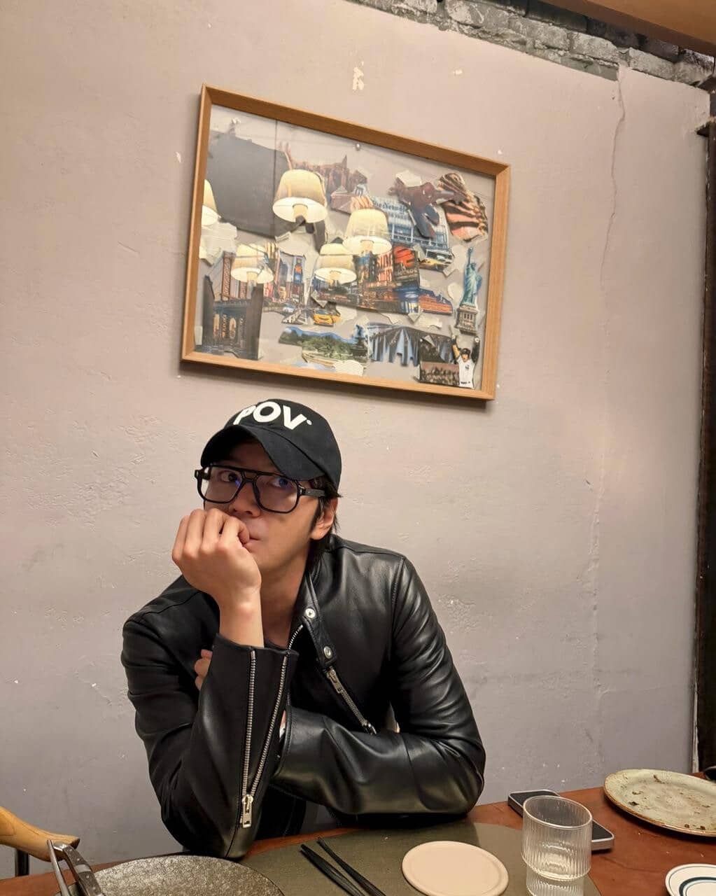 また、片手であごを支えながらカメラを見つめるポーズも印象的で、食事の合間にリラックスした表情を見せた一瞬が切り取られている。壁には都市の風景を重ねたアートが飾られ、落ち着いた店内の雰囲気と調和している。