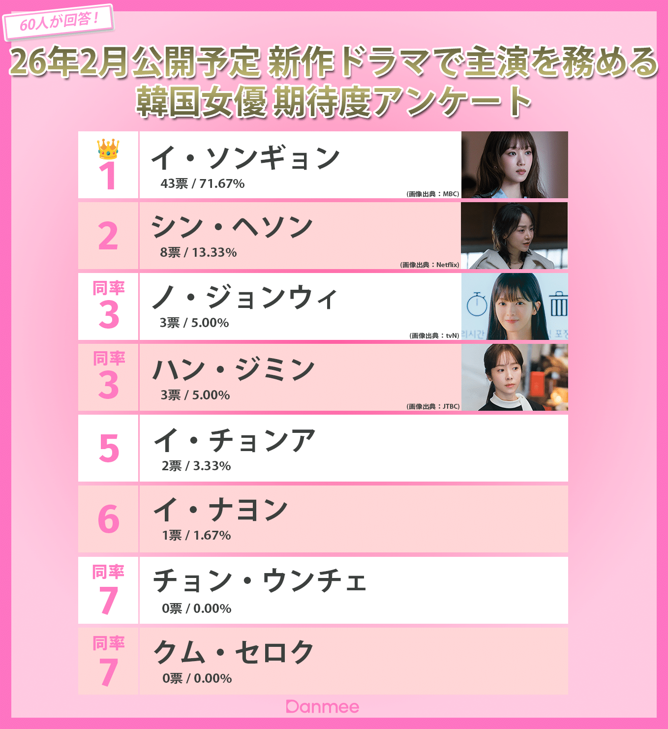 『26年2月公開予定 新作ドラマで主演を務める韓国女優 期待度アンケート』 全順位