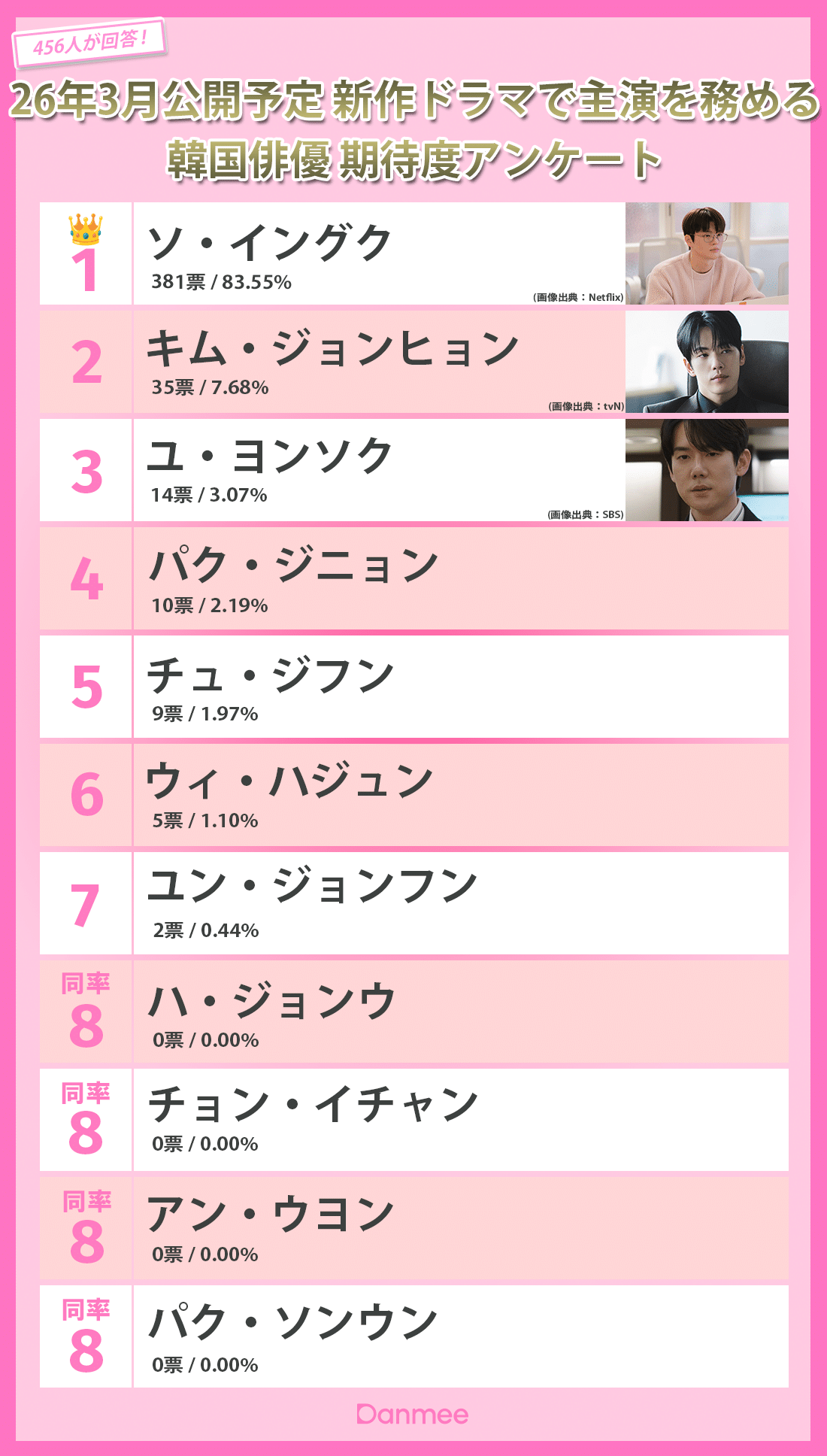 『26年3月公開予定 新作ドラマで主演を務める韓国俳優 期待度アンケート』 全順位