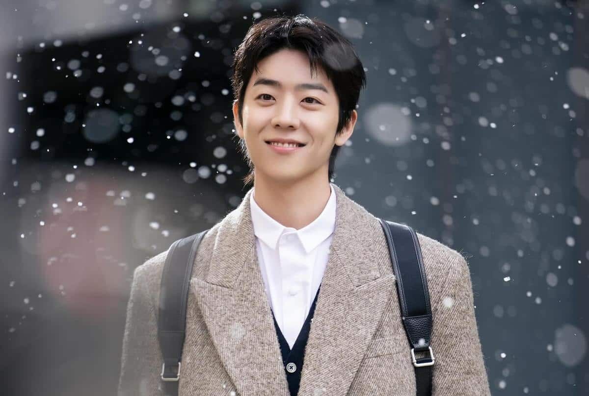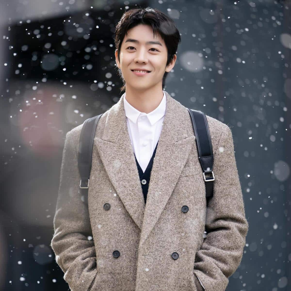背景にはグレーの建物とぼかしの効いた照明が混ざり合い、舞い散る雪とともに幻想的な雰囲気に。前景と背景が柔らかくぼやけた中、チェ・ジョンヒョプだけが鮮明に捉えられ、自然と視線がその笑顔へと導かれた。